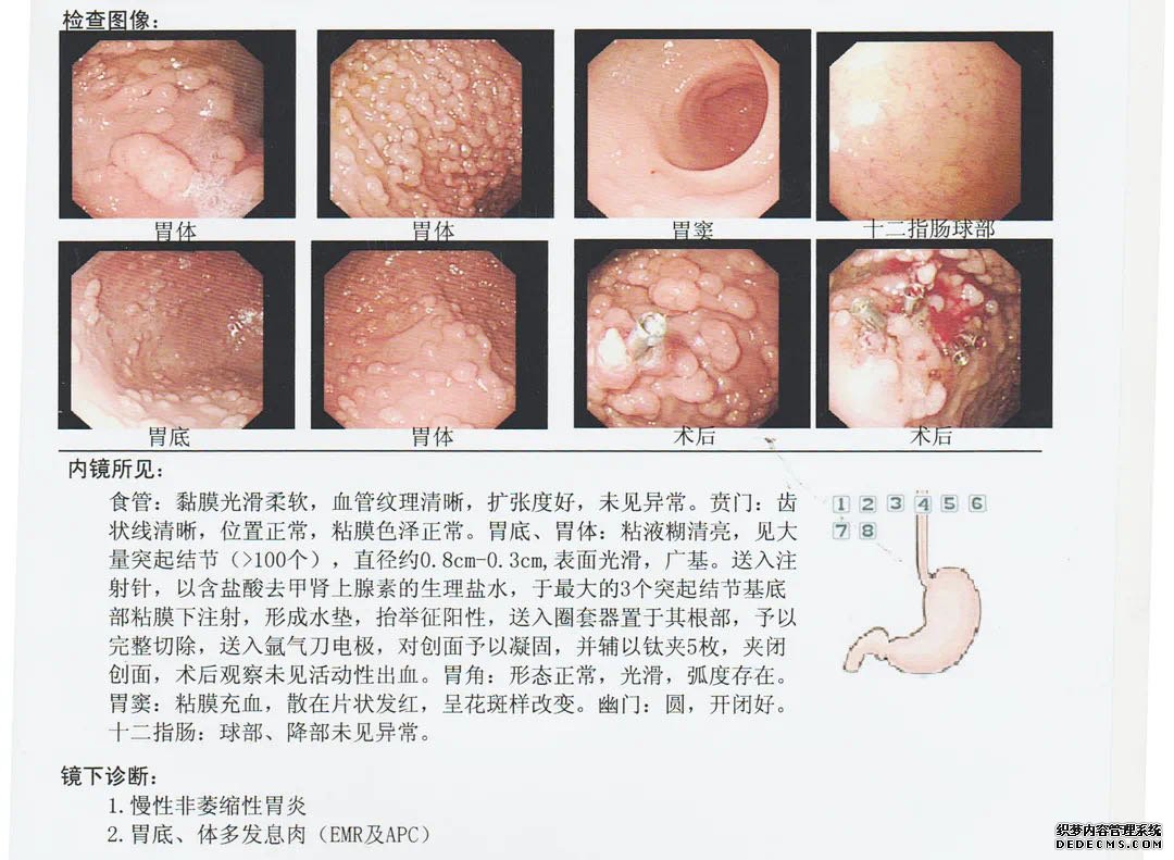 所以,胃镜一经发现,应必须取活检,做活检的目的就是通过病理证实息肉是腺瘤性息肉还是增生性息肉,如果是腺瘤性息肉,原则上需要切除治疗,以绝后患。